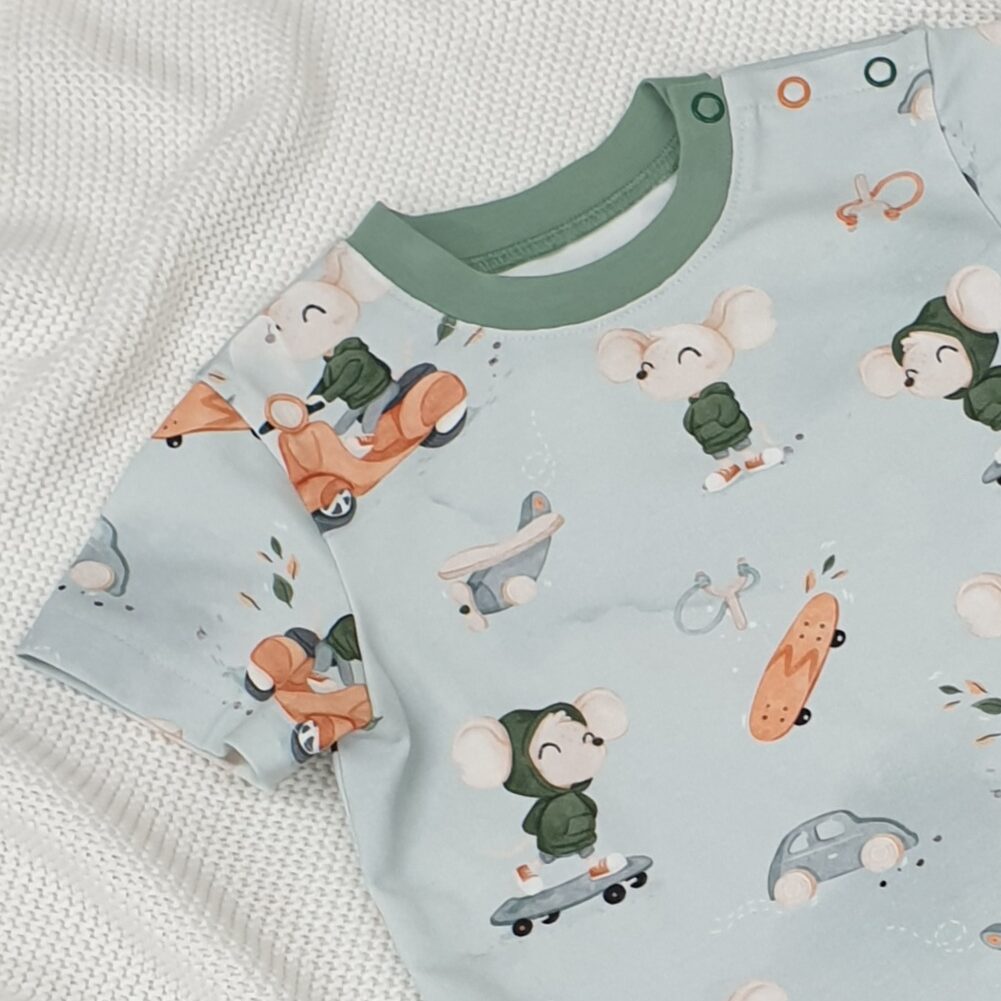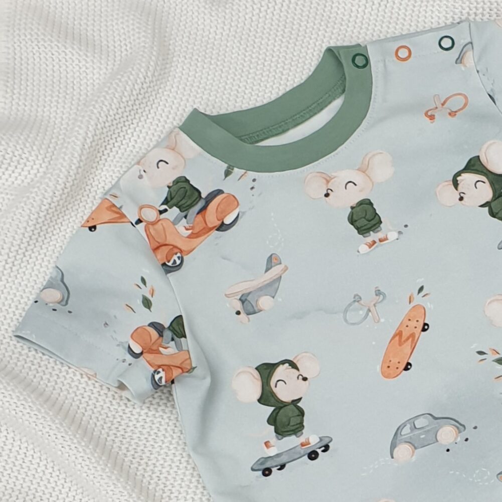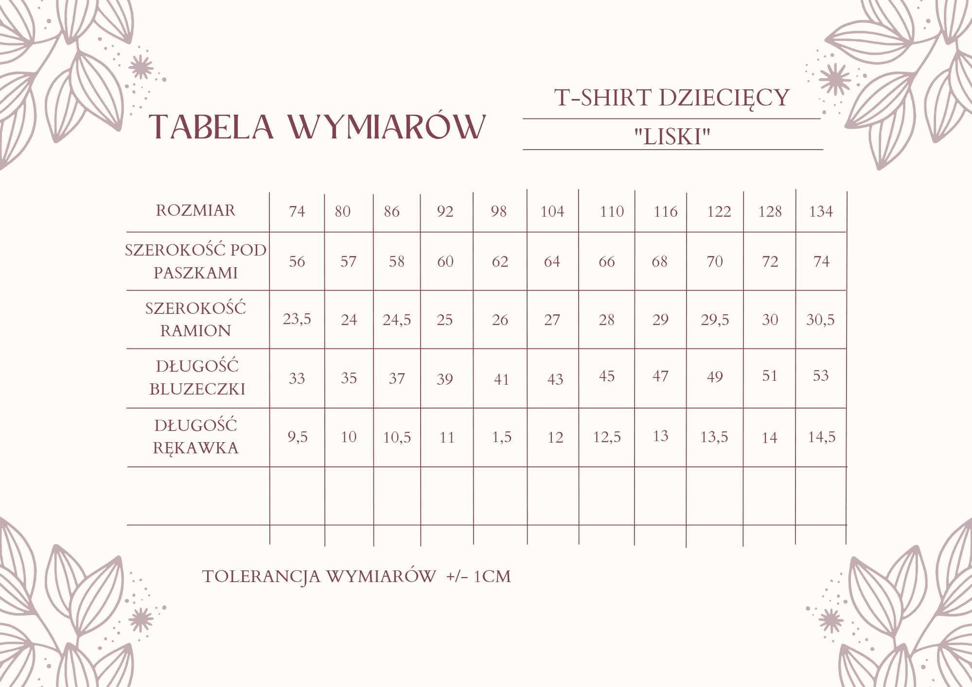 Bluzeczka dla maluszka typu t-shirt z dzianiny jersey z pięknym printem w liski na białym tle. Dekolt “w serek” wykończony pliską. Możliwa zmiana kształtu dekoltu na życzenie klienta na “okrągły”.