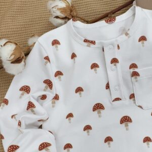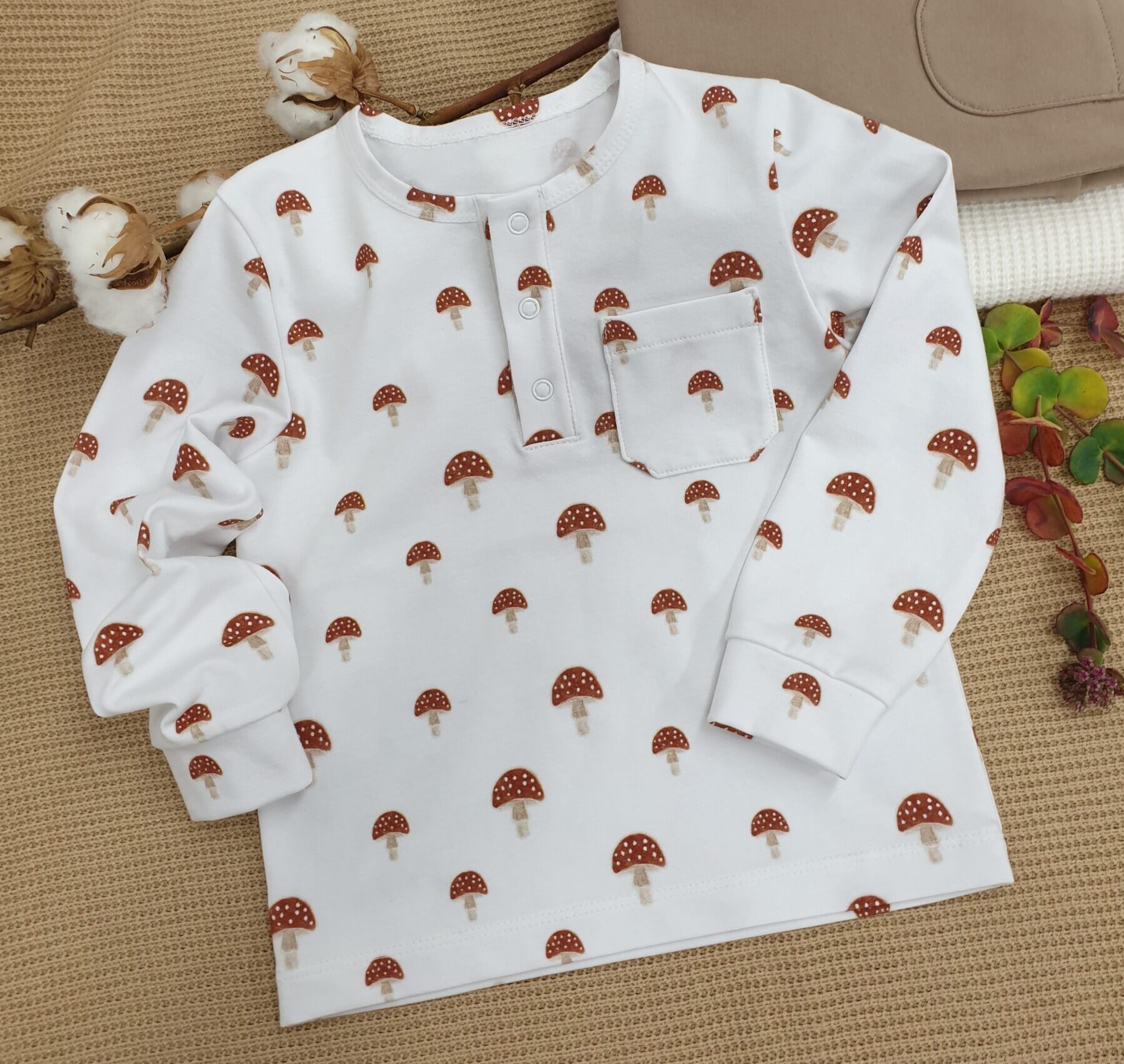 Bluzeczka dla maluszka z dzianiny jersey BIO. W przodzie naszyta kieszonka. Dekolt półokrągły wykończony lamówką. Po środku przodu zapięcie typu “polo” zapinane na napy typu “spring”. Takie rozwiązanie pozwala na bardzo swobodne wkładanie i zdejmowanie koszulki. Delikatny print w muchomorki sprawi , że maluszek w tym modelu będzie wyglądał uroczo. Koszulki bawełniane to nieodzowna część garderoby dla każdego dziecka , na każdą porę roku. Masz do wyboru wariant, z długim lub z krótkim rękawem.
