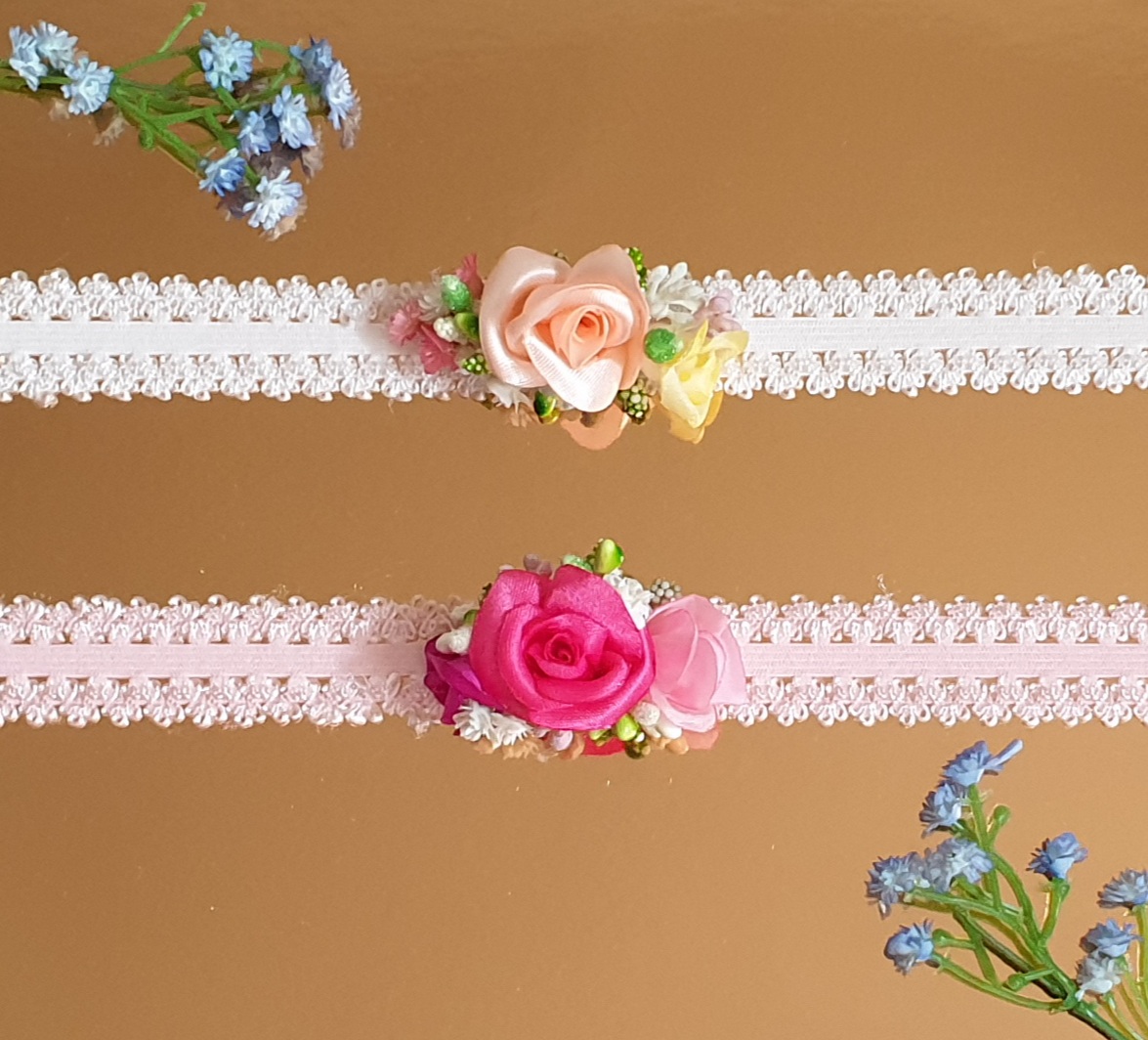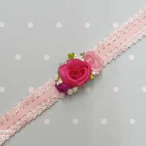 Opaska koronkowa elastyczna dla dziewczynki. Różyczki wykonane ręcznie z tkaniny atłasowej. Całość wykonana na pięknej gumokoronce. Idealna na chrzest, roczek lub inną ważną okazję dla dziewczynki. Będzie pięknym uzupełnieniem dziecięcej stylizacji, doda jej uroku i elegancji.