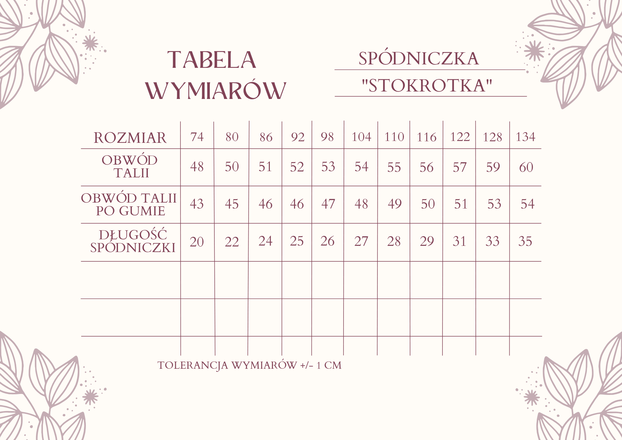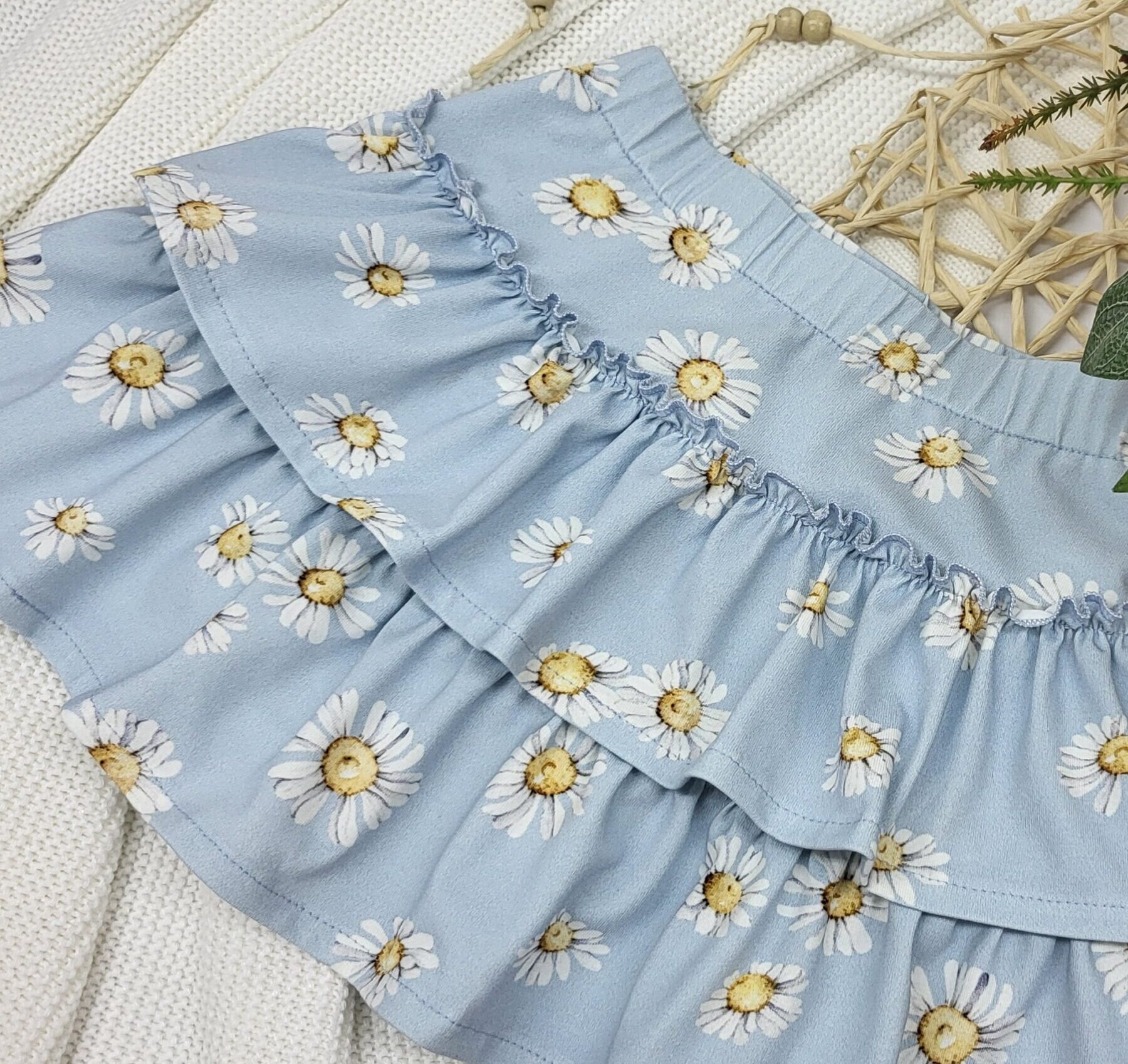 Spódniczka uszyta jest z dzianiny jersey 200g. Jej trapezowy krój z dwoma falbankami i printem w rumianki na błękitnym tle tworzą piękną całość. W talii guma, od wewnątrz regulowana na guziczek. Takie rozwiązanie to doskonały pomysł, który umożliwia regulację obwodu pasa we własnym zakresie.