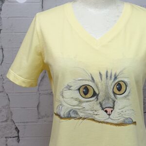 T-shirt damski z ręcznie malowaną aplikacją. Aplikacja malowana jest profesjonalnymi farbkami do tkanin. Farbki odporne na ścieranie i bezpieczne dla zdrowia. Aplikacja dodatkowo ozdobiona jest detalami. T-shirt to najczęściej noszona część garderoby bez względu na porę roku. Będzie świetnym uzupełnieniem do stylizacji jeansowej lub sportowej. To wyjątkowyi oryginalny look.